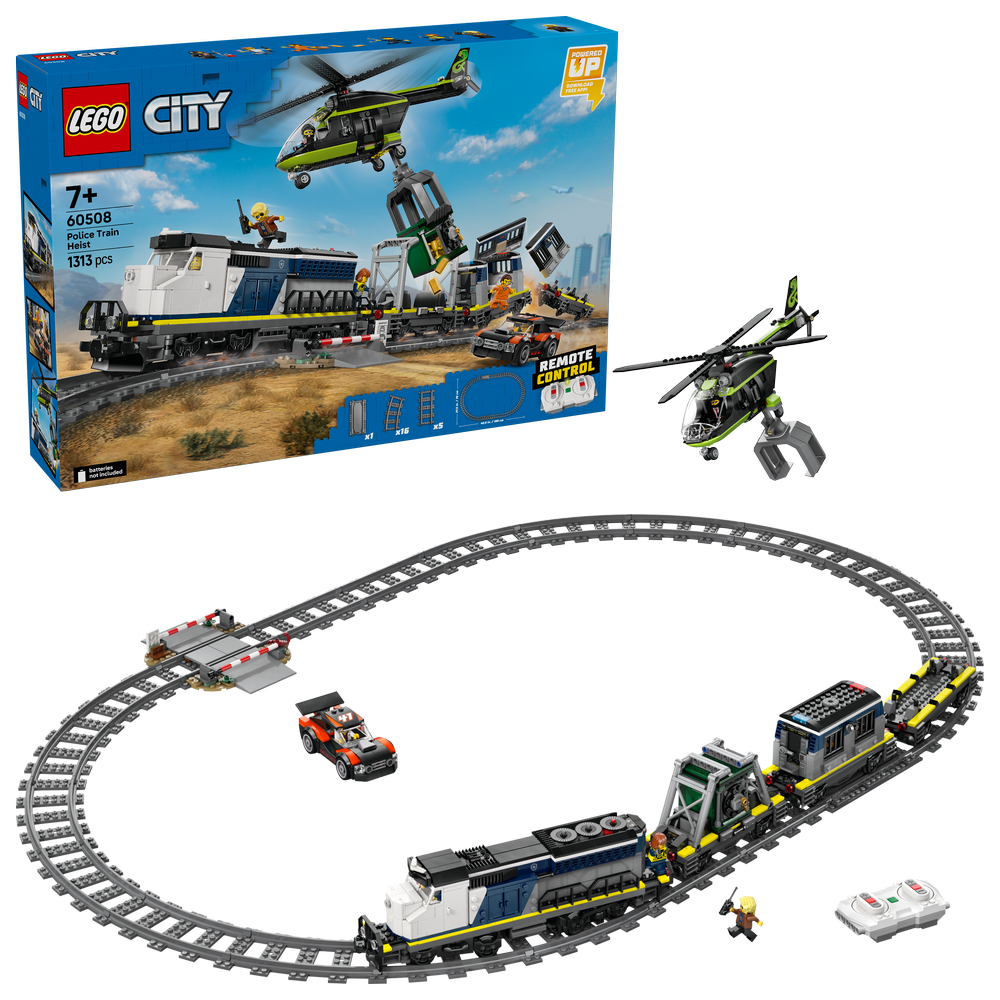All aboard for action-packed adventures with the LEGO City Police Train Heist! The city police are transporting a captured crook, his getaway rally car and a stolen bank safe on the police train. But the crooks have other ideas and have modified a helicopter with a huge grabbing claw to perform the most daring heist in history. Will they succeed or will the LEGO City police save the day?