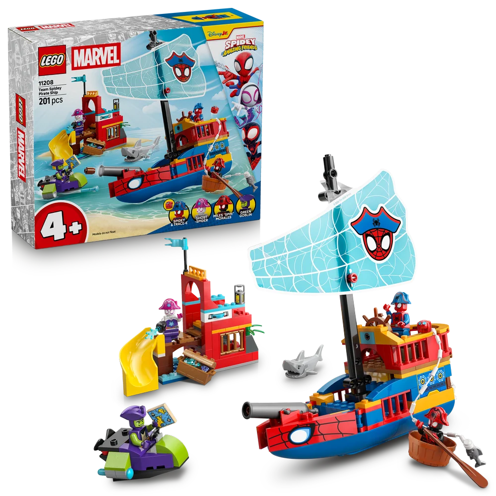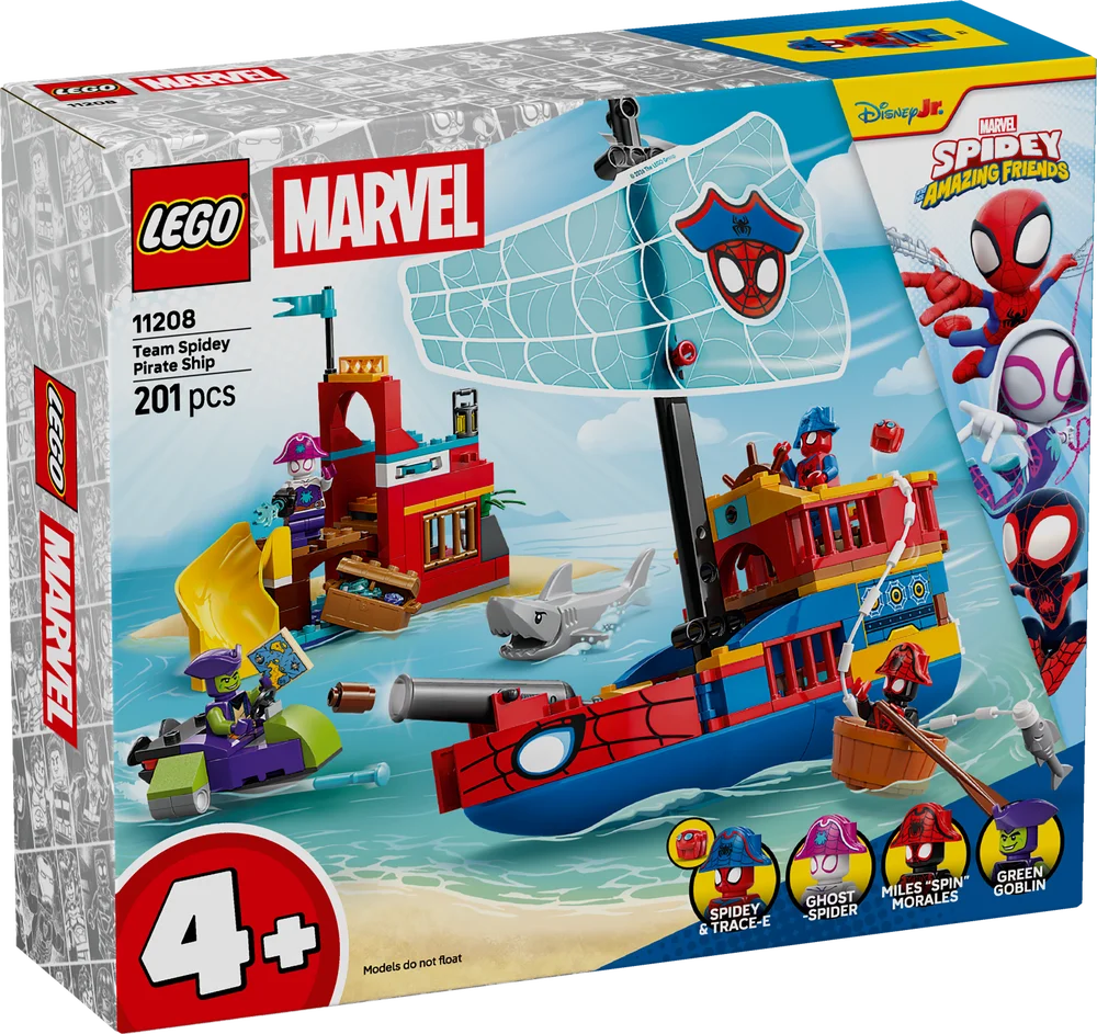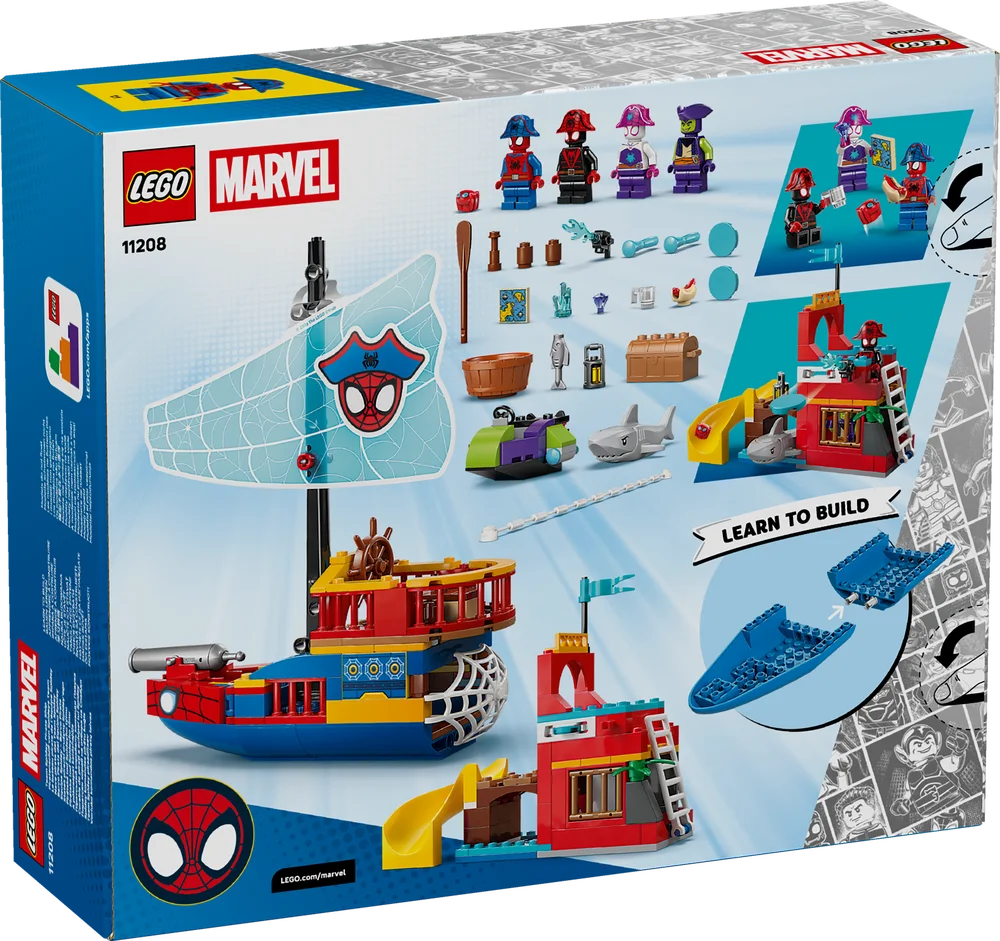 Set sail on a Spidey pirate adventure! Help Spidey steer the pirate ship, fire the cannon, and stop Green Goblin from stealing treasure. Ghost-Spider guards the island with her shooter and water blaster, while Spin patrols the sea in his tub. After a busy day of pirate action, the whole team gathers on the top deck for a hot dog and a drink! Join Spidey’s crew for web-swinging, sea-splashing fun!