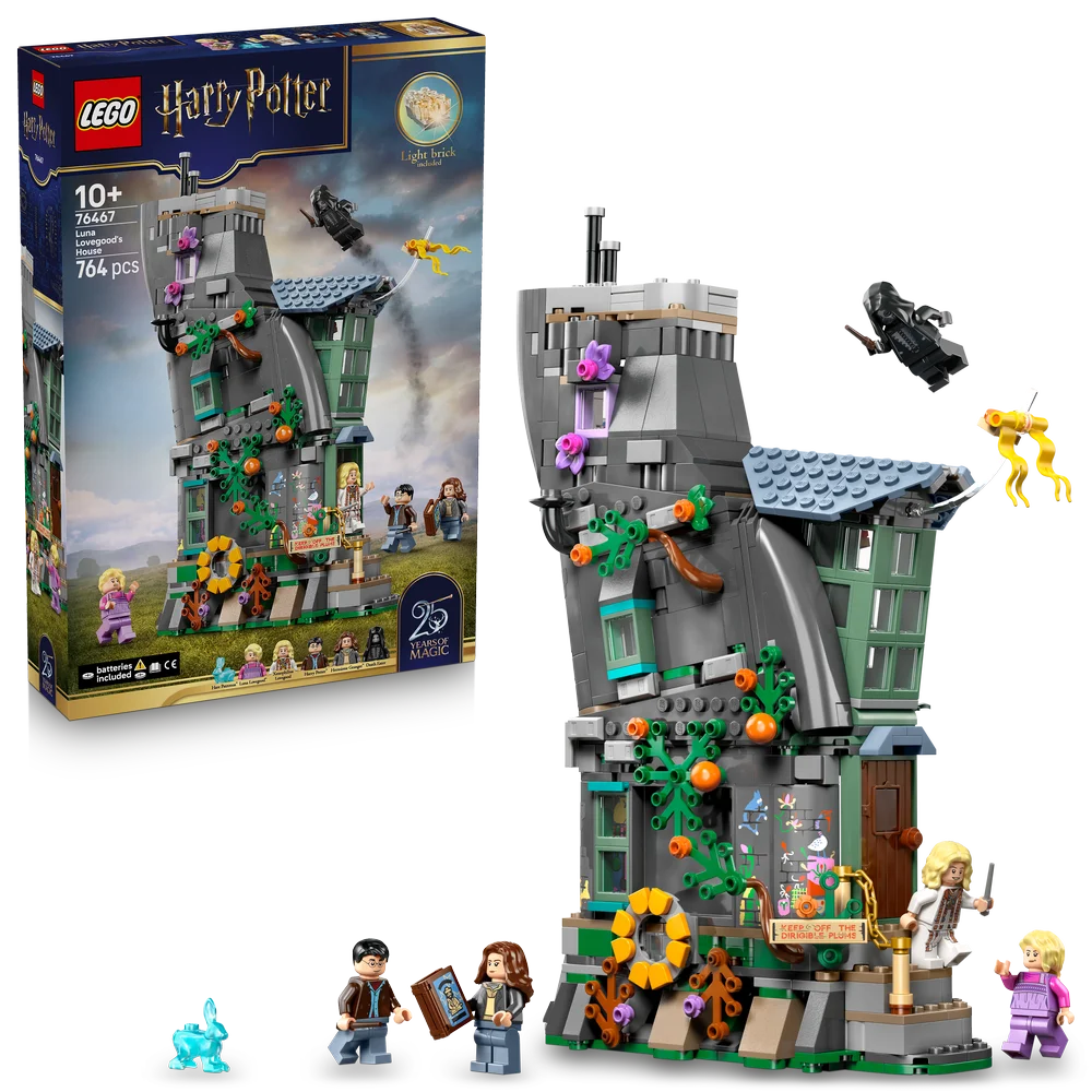 Visit the Lovegood family’s quirky house with Harry Potter and Hermione Granger. Project images from The Tale of the Three Brothers onto the kitchen wall with the LEGO light brick projector. Check out Luna Lovegood’s bedroom. Explore Xenophilius Lovegood’s printing workshop. Look out for the LEGO Harry Potter 25th anniversary collectable Hare Patronus… and beware of the Death Eater!
