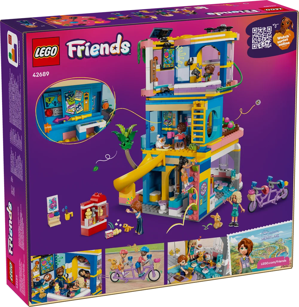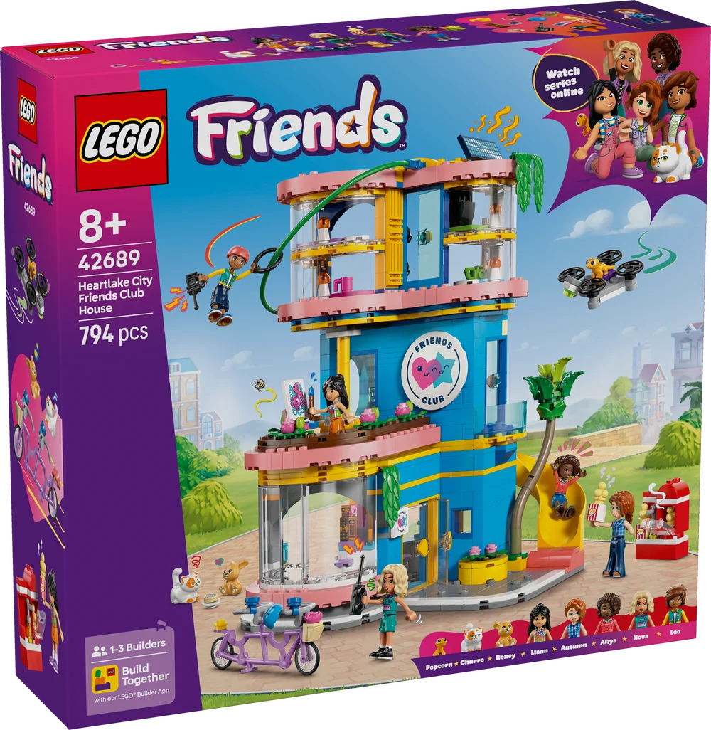 Get ready for adventure and fun missions at the Heartlake City Friends Club House! Join Autumn, Nova, Aliya, Leo, Liann and pets Churro, Honey and Popcorn as they enjoy the activities. Try out the zip line, slide and climbing wall. Solve a mystery with the hidden computer or make snacks in the kitchen. And with Build Together mode in the LEGO Builder app, your friends and family can join the fun.