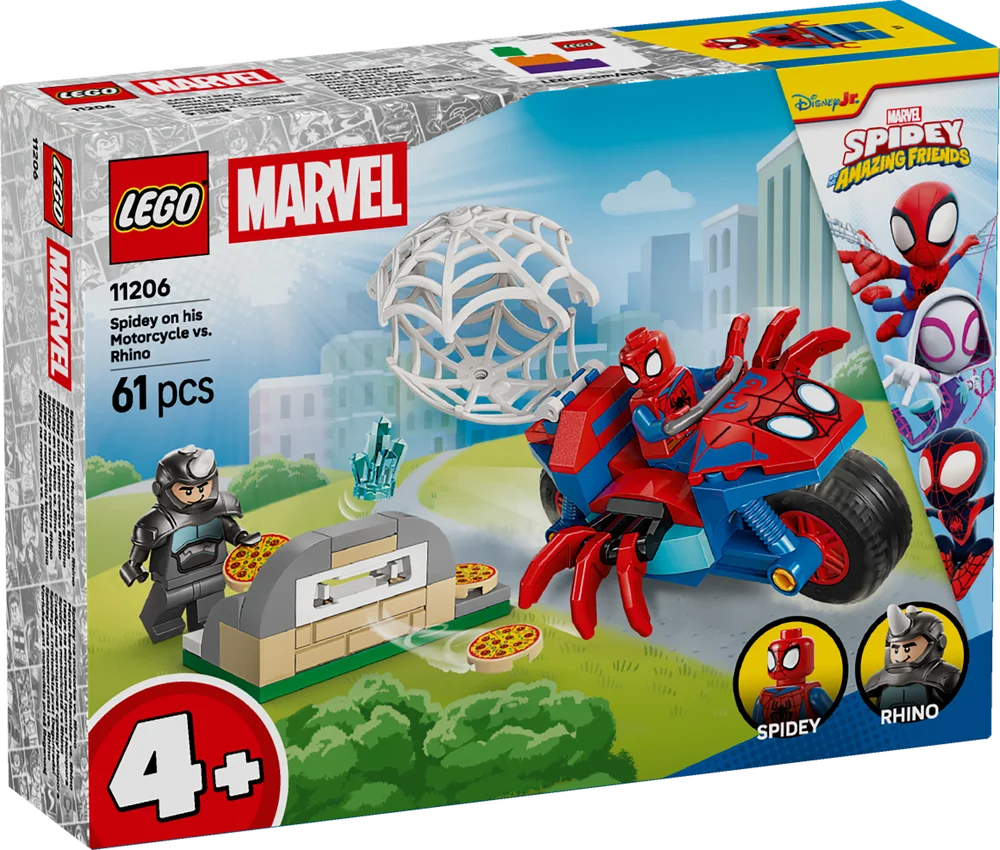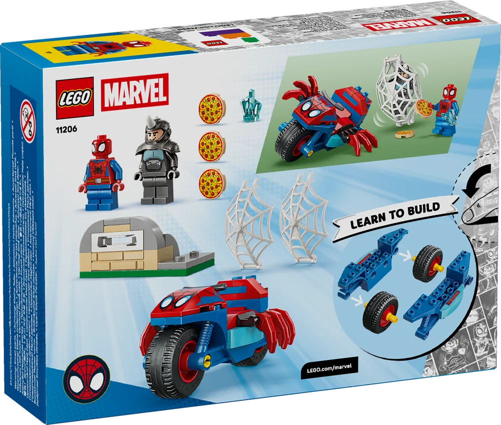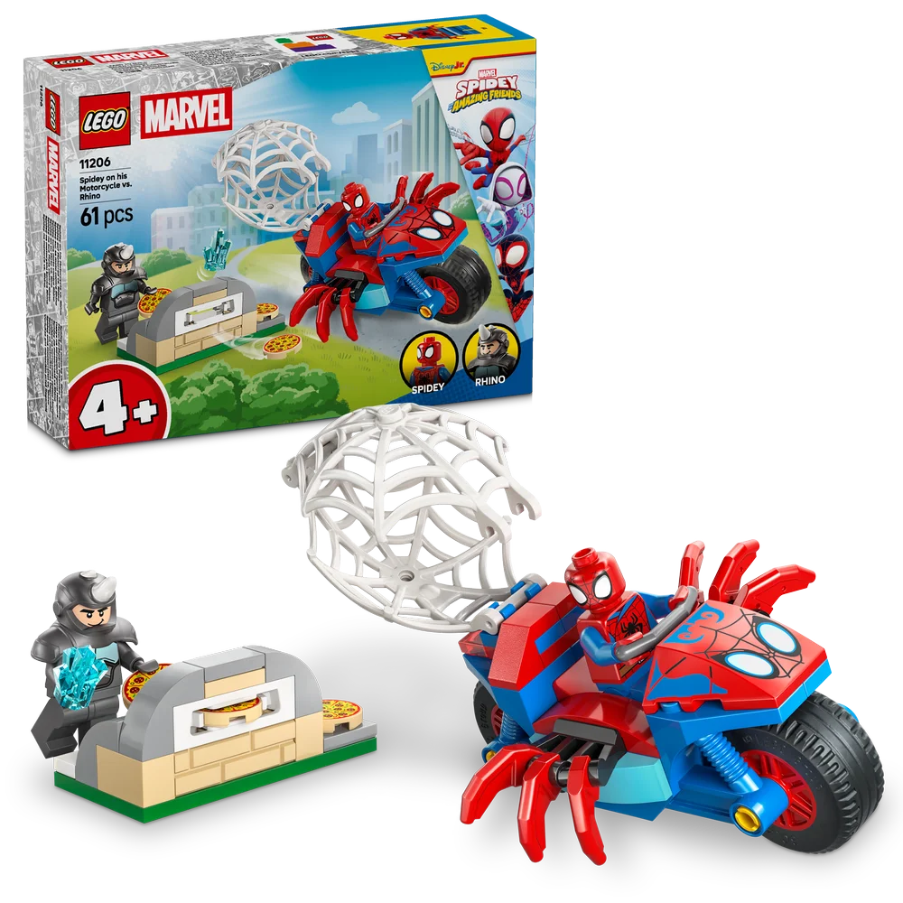 Includes Spidey and Rhino minifigures, a motorbike and a large Starter Brick