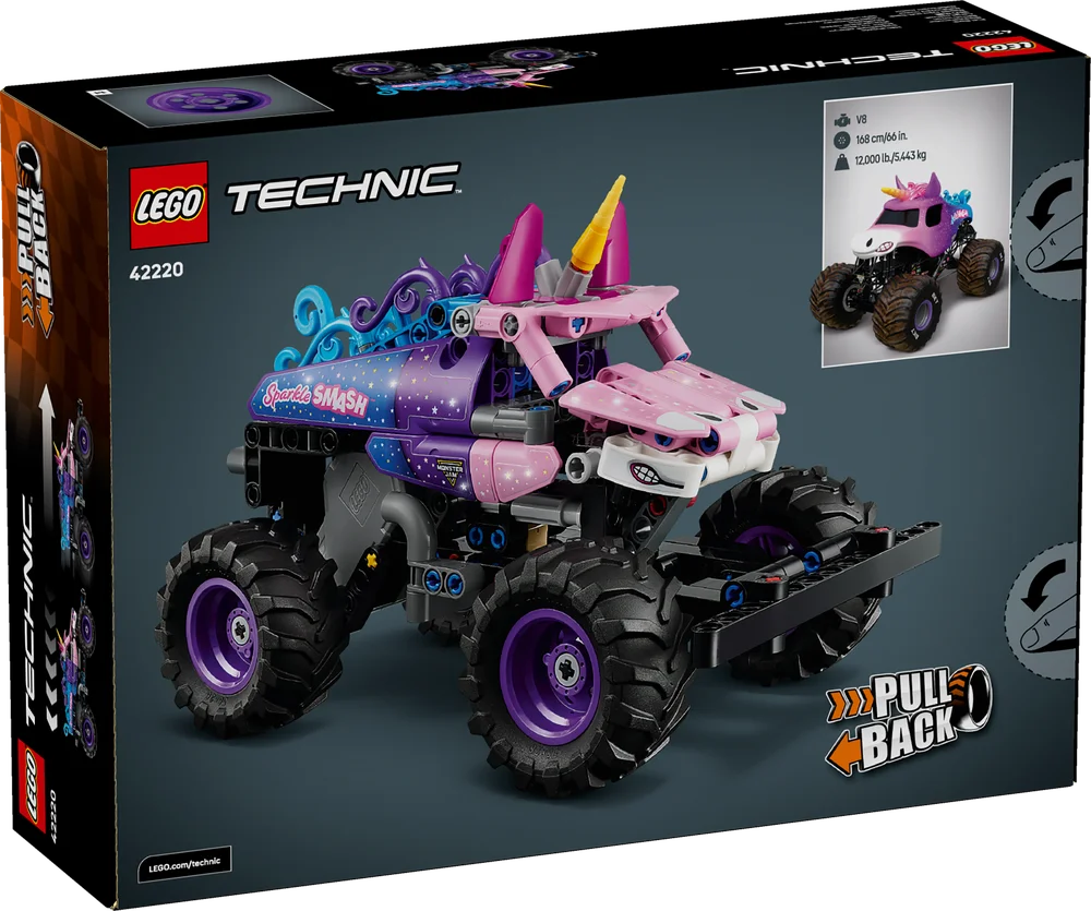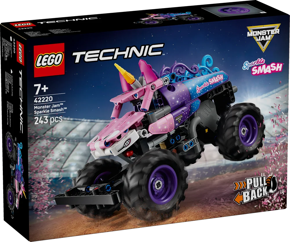 Get ready for wild moves and daring stunts with Monster Jam Sparkle Smash. This mighty truck is packed with attitude and ready to take on its rivals. Build the truck with its huge tyres and iconic design. Then pull back the vehicle to send it speeding along as you recreate the jaw-dropping tricks of the Monster Jam arena!