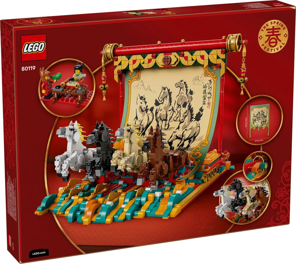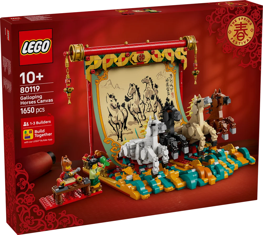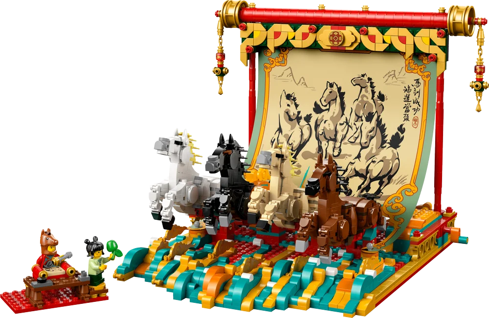Showcase the artistry of traditional brush painting with this Spring Festival model. Hang the canvas of galloping horses. Pose the 4 brick-built horses’ legs and turn the handle to make the horses move, as if galloping out of the painting. Attach the scene of 2 minifigures painting. And with Build Together mode in the LEGO Builder app, your family and friends can join the creative fun.