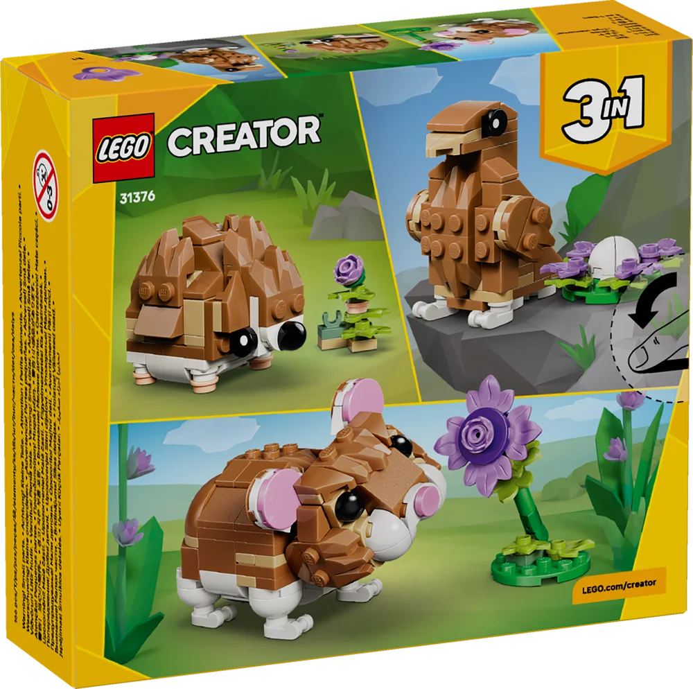 Enjoy fun-filled adventures with 3 LEGO animals! Play with a cute hamster and a beautiful purple flower. Then rebuild it into an adorable hedgehog with a flower or a friendly eagle guarding its egg. What will you build? The choice is yours with this amazing 3 in 1 animal playset.