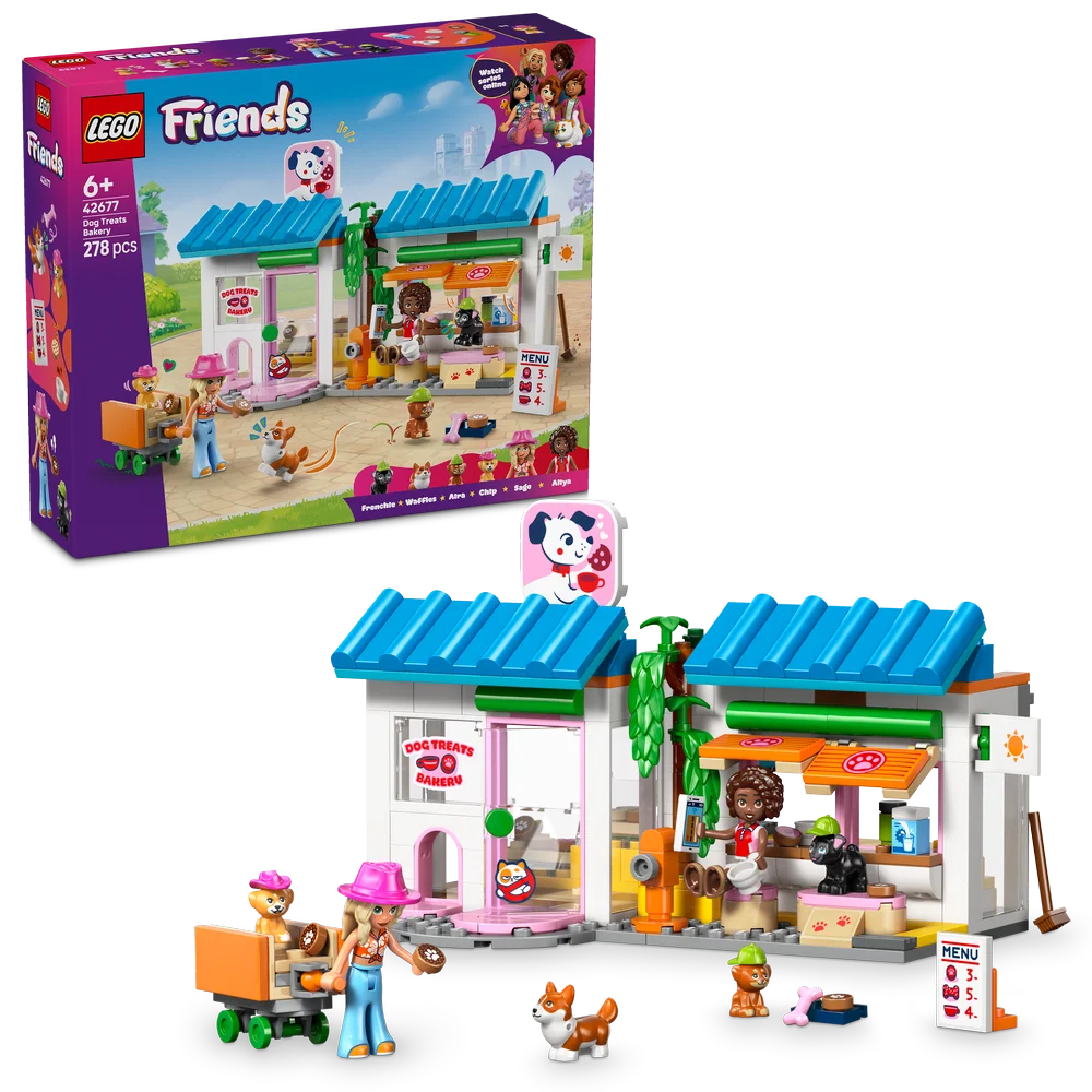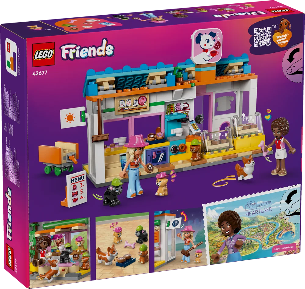 Ready for furry fun at the LEGO Friends Dog Treats Bakery? This is where Aliya, Sage and their pets love to hang out. Dogs are given a special welcome with their own pet door! There’s also a pet carrier for the pups to ride in. They can even help serve by climbing the ramp to the counter. The kitchen has everything needed to create tasty treats for the dogs – and their humans! Woof!