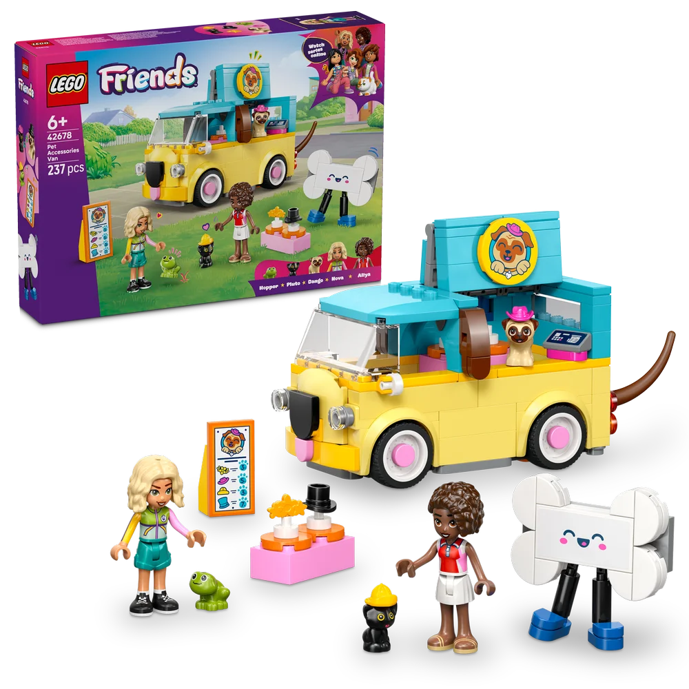 The LEGO Friends Pet Accessories Van is on its way! Help the kitten, dog and frog find the perfect accessories. See the van’s adorable pug design with a wagging tail. Open the van to reveal the accessories and create a fun display, then put on a pet fashion show!