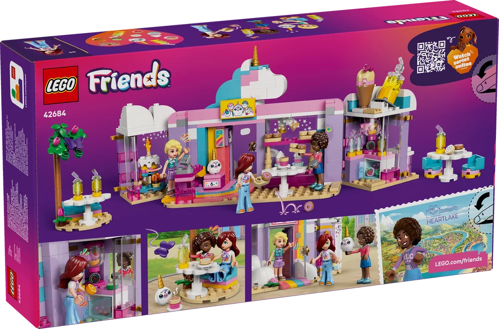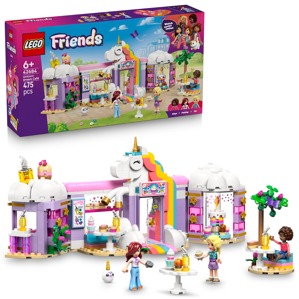 Cupcakes, rainbows and a little unicorn sparkle! You’ll find them all at the LEGO Friends Unicorn Dream Café. Help café owner Iza assemble sweet treats, then display them on the turntable in the window. Join Paisley and Aliya as they choose their favourite cupcakes, biscuits, doughnuts and juices. Then head to the outdoor seating where the friends can sit and snack together.