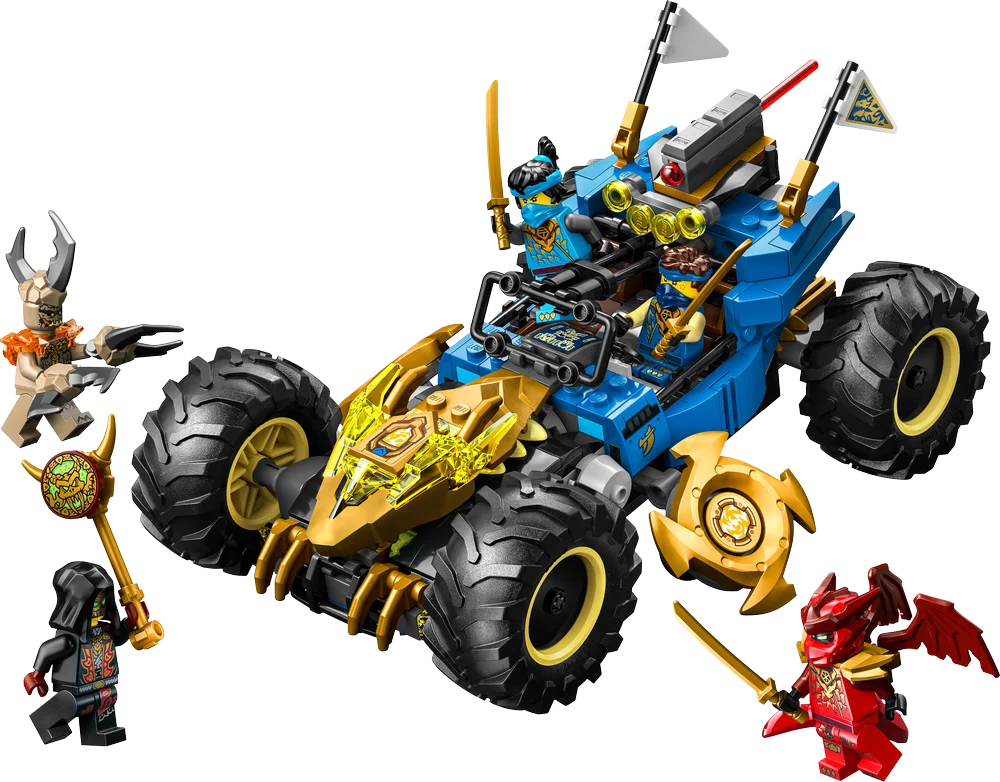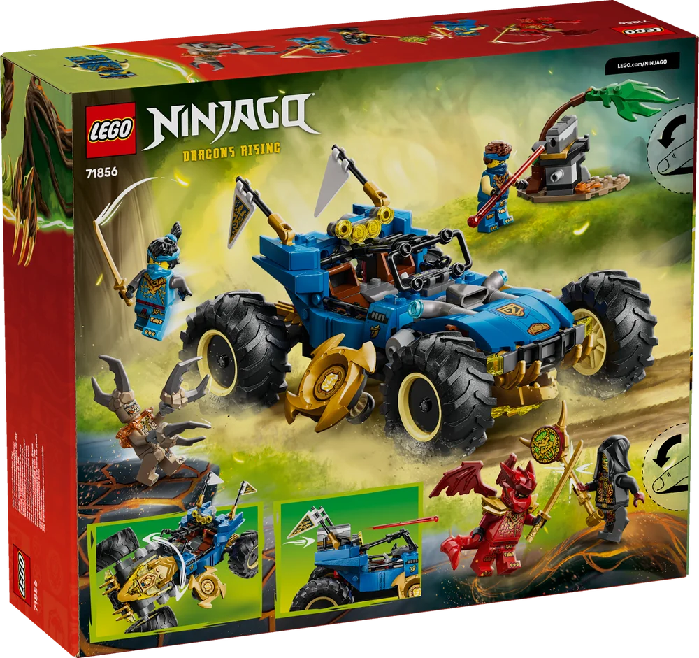 Team up with Jay, Nya and dragon form Kai to chase villains through the Whispering Woods. Get behind the wheel of Jay’s Transforming Car before boosting it into dragon mode with rotating shurikens and fire its spring-loaded shooter to take down Earth Monster and Loyalist Leader before they can get away! The ninja must defeat them to protect the Merged Lands.