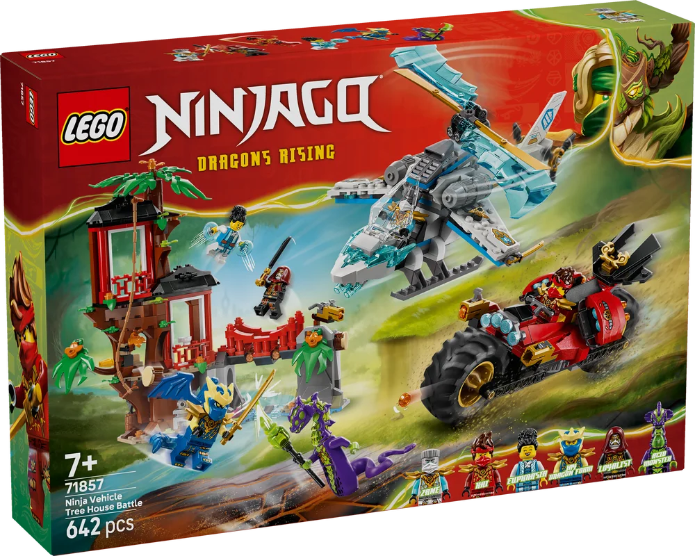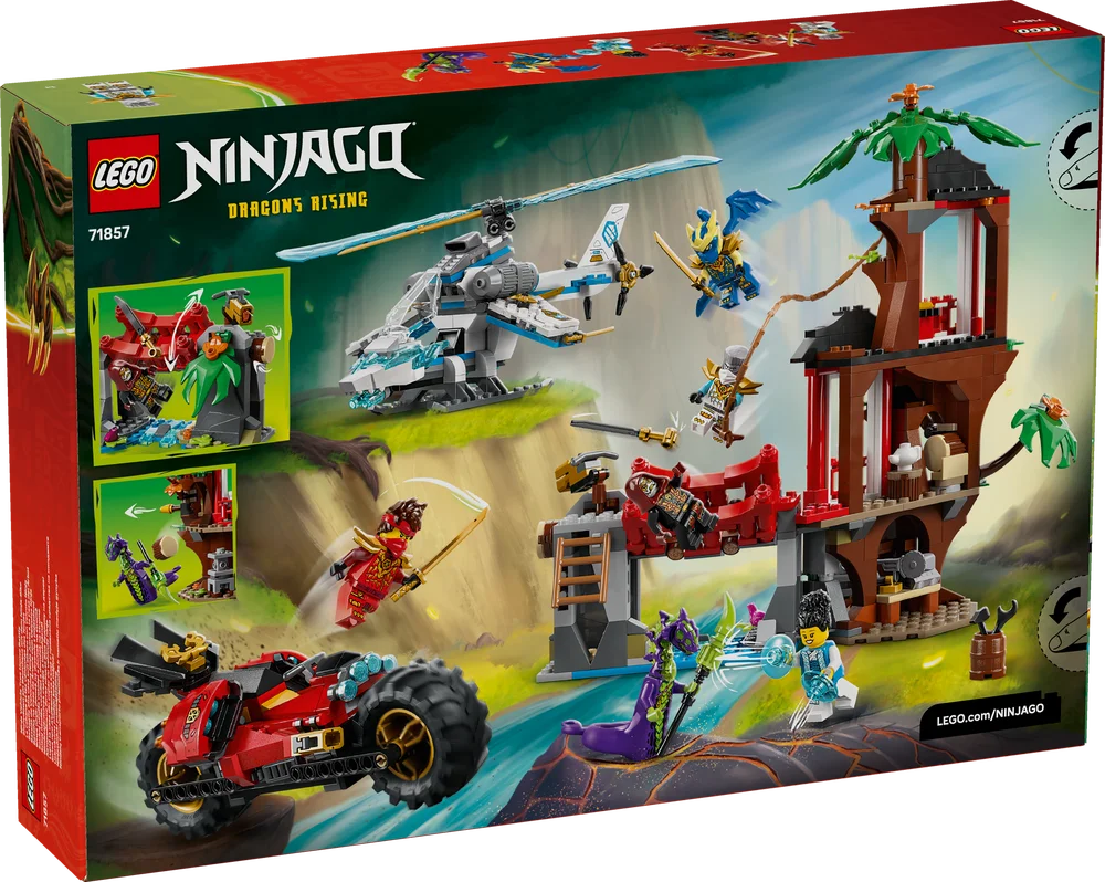 Team up with Kai, Zane, dragon form Jay and Euphrasia to defend their tree house hideout. Be on alert for an attack in the Whispering Woods from the Acid Monster and the Loyalist. Swing into action on a vine rope or stop them with a secret trap that releases a rock and a bridge that spins around. Afterwards, jump into Zane’s helicopter or Kai’s ninja motorcycle to deliver the knockout blow!