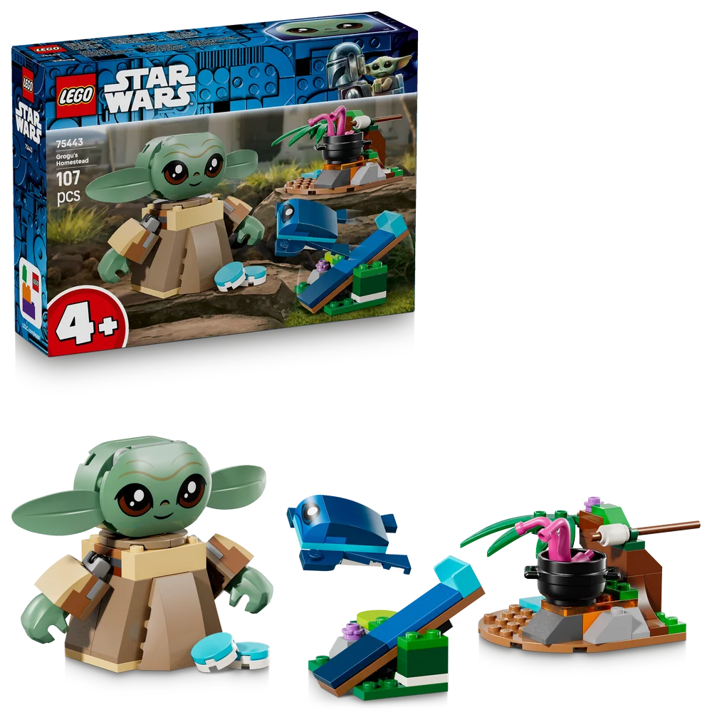 Have fun hanging out with Grogu at his homestead. Pose the cute character’s head, arms and hands. Use the catapult to make the Sorgan frog leap! Place a pot on the fireplace to cook tentacles. Help Grogu toast a marshmallow over the fire. And if Grogu is still hungry, grab a blue macaron!