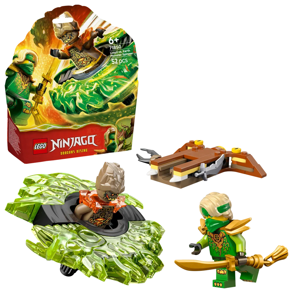 A cool NINJAGO playset with everything you need to enjoy exciting ninja battles! Place the Earth Monster in the spinner toy, push the launcher’s button and watch as it goes into a quick spin. When the spinner hits its target, 2 of its elemental power parts might fly off! Lloyd must avoid the spinner’s destructive path and take down the monster to save the Merged Lands.